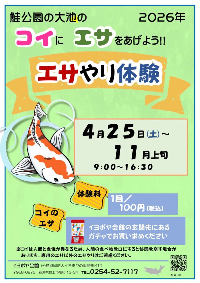 | その他 | イヨボヤ会館の玄関先にあるガチャで販売します(2026年4月25日より) 9時~16時30分 ※7月より水曜日は休館日です(祝日の場合は翌日)。 ※コイは人間と食性が異なるため、人間の食べ物を口にすると体調を崩す場合が あります。専用のエサ以外のエサやりはご遠慮ください。 |