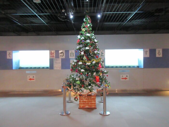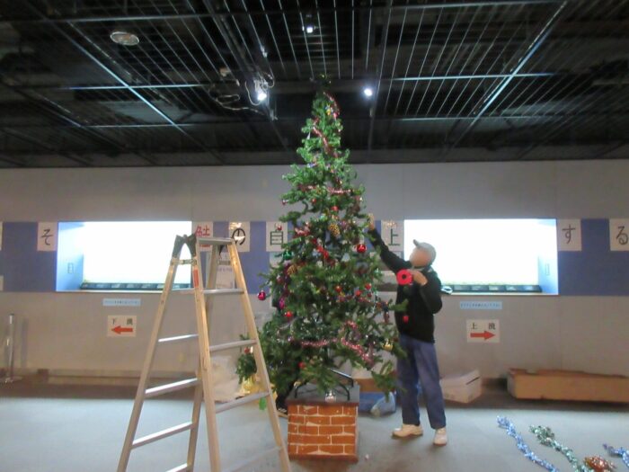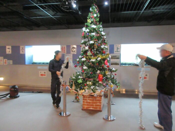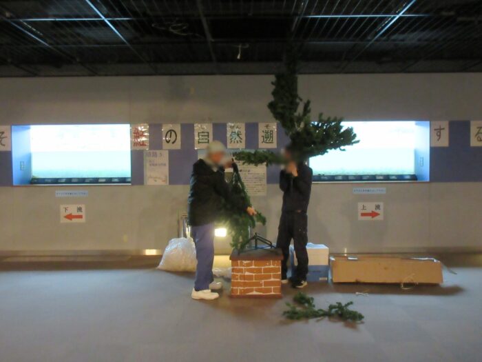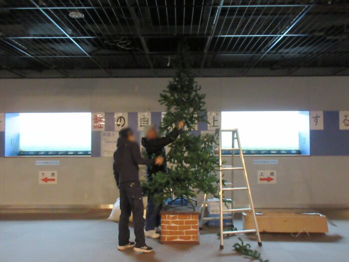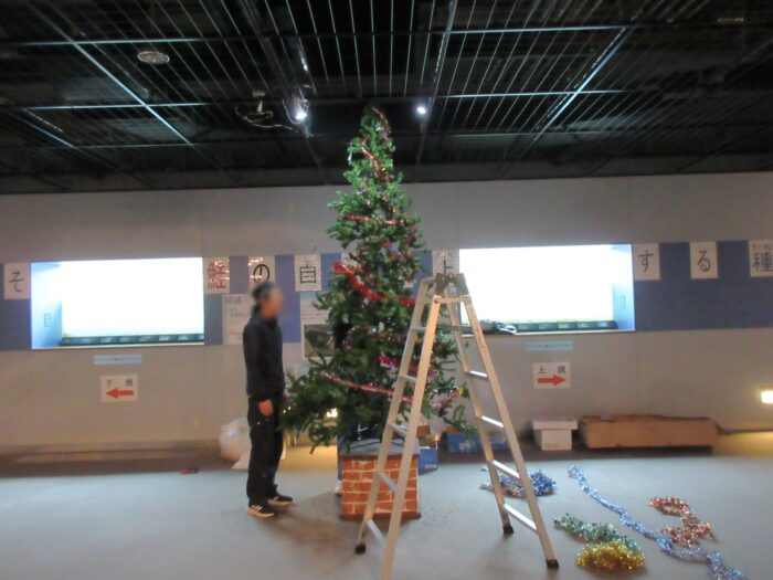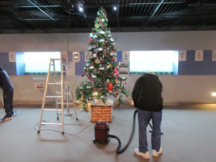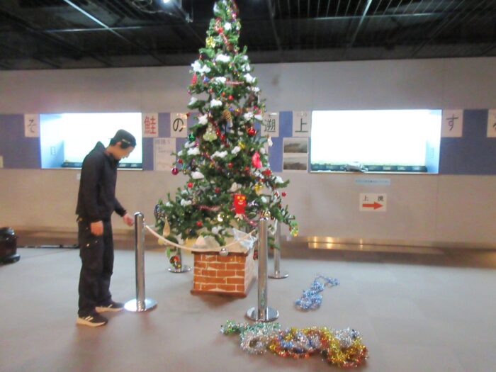 日)、イヨボヤ会館地下の三面川鮭観察自然館の観察室にクリスマスツリーを飾りました。