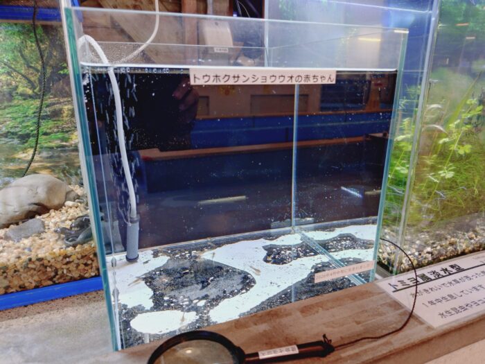 4月19日に紹介しました、バックヤードで保護しているトウホクサンショウウオの赤ちゃん。昨日(4月23日)、養魚担当者がイヨボヤ会館内のミニふ化場に設置した水槽に赤ちゃんを移しました。小さくて、とてもかわいいですよ。水槽前には虫眼鏡も用意しています。
