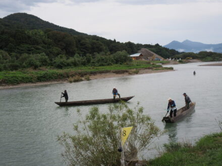 10月21日から11月30日まで、三面川(みおもてがわ)で、「居繰網漁(いぐりあみりょう)」が行われています。今では村上市の三面川(みおもてがわ)だけに残ってる江戸時代から伝わる伝統漁法です。三面川の川幅いっぱいに設けられた柵(ウライ)の下流で行われ、漁師たちが「小回し舟」と呼ばれる川舟を巧みに操り、網で鮭を捕えます。