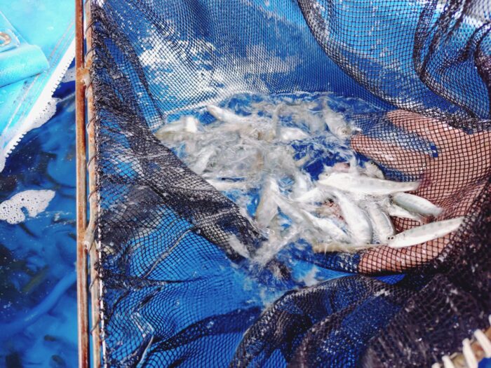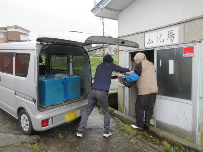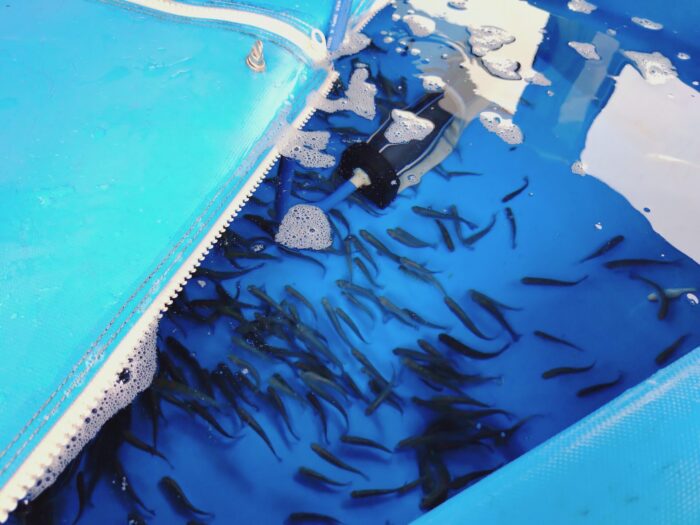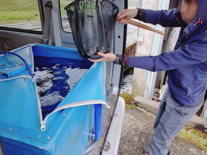 目的は、ニジマスの稚魚の購入です。車に酸素ボンベや水槽などを積んでの訪問。魚沼支場職員が室内の大型水槽からタモに入れたニジマスの稚魚を運んできます。当館養魚担当職員がそのタモを受け取り、乗ってきた車に設置した水槽へ丁寧に稚魚を入れていきました。