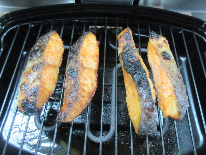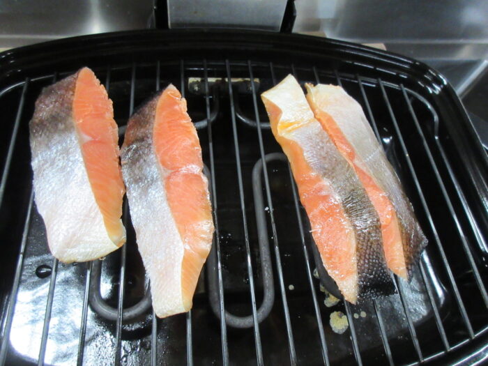 今年1月に干し上げ、切り身で冷凍していた養殖サーモンを、関係者試食前にメンバーが実際に焼いてみました。近々、関係者で試食を行います。