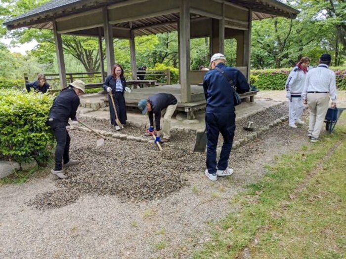 5月24日、村上岩船ロータリークラブの皆さまが、社会奉仕活動の一環として、村上市鮭公園内にある東屋周辺の整備作業を行ってくださいました。平成27年から、種川周辺の環境整備等の活動をされており、種川に隣接する鮭公園についても事業の対象として実施いただいています。今年は東屋周辺の砂利敷き作業を行っていただきました。