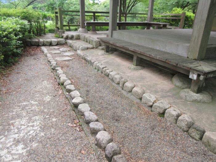 ↑一輪車などを使用して、東屋周辺へ砂利を運びます。