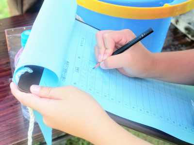 川から上がった後は、各自採取した生き物たちの名称を富樫先生に教えていただきながら、記入用紙に記録していきました。